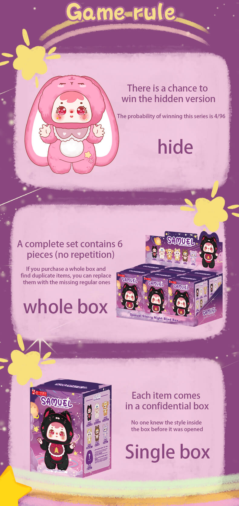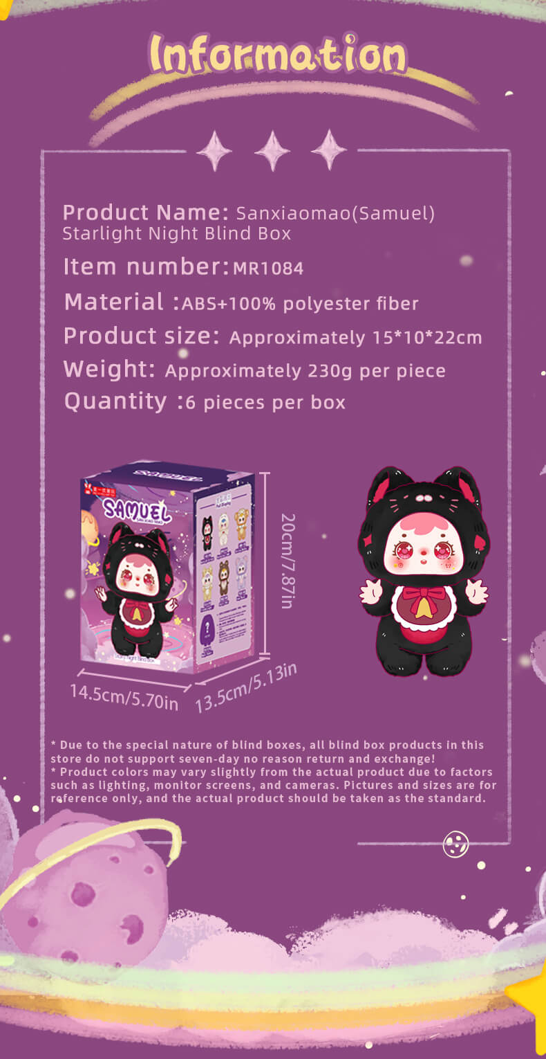 J'aime bien la série Samuel Blind Box Family, Starry Night. C'est comme si vous pouviez choisir un morceau du ciel et ensuite vous serez, dans un beau pays des rêves. La série Samuel Blind Box Family est très jolie, je pense que la nuit étoilée est ma préférée.