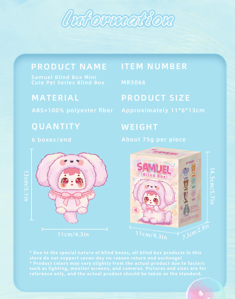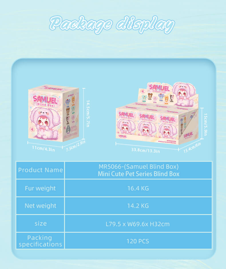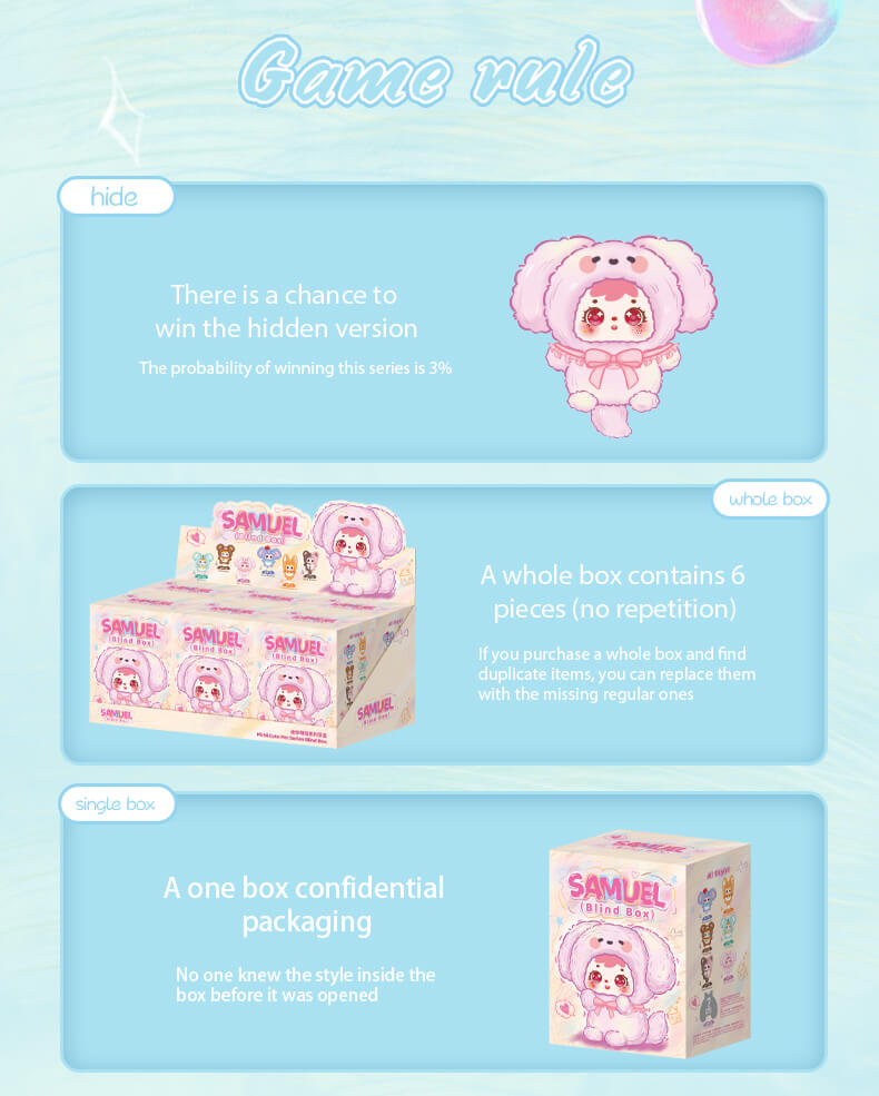The Samuel Blind Box family has some members and they are really cute. The Mini Cute Pets series. These are animals that Samuel turns into. They are small. They have a lot of love to give. You can take the Mini Cute Pets with you wherever you go and they will be your friends. The Samuel Blind Box Mini Cute Pets are small enough to fit in your hand, which is why we call them palm- pets. The Mini Cute Pets from Samuel Blind Box are always there, for you no matter where you are.