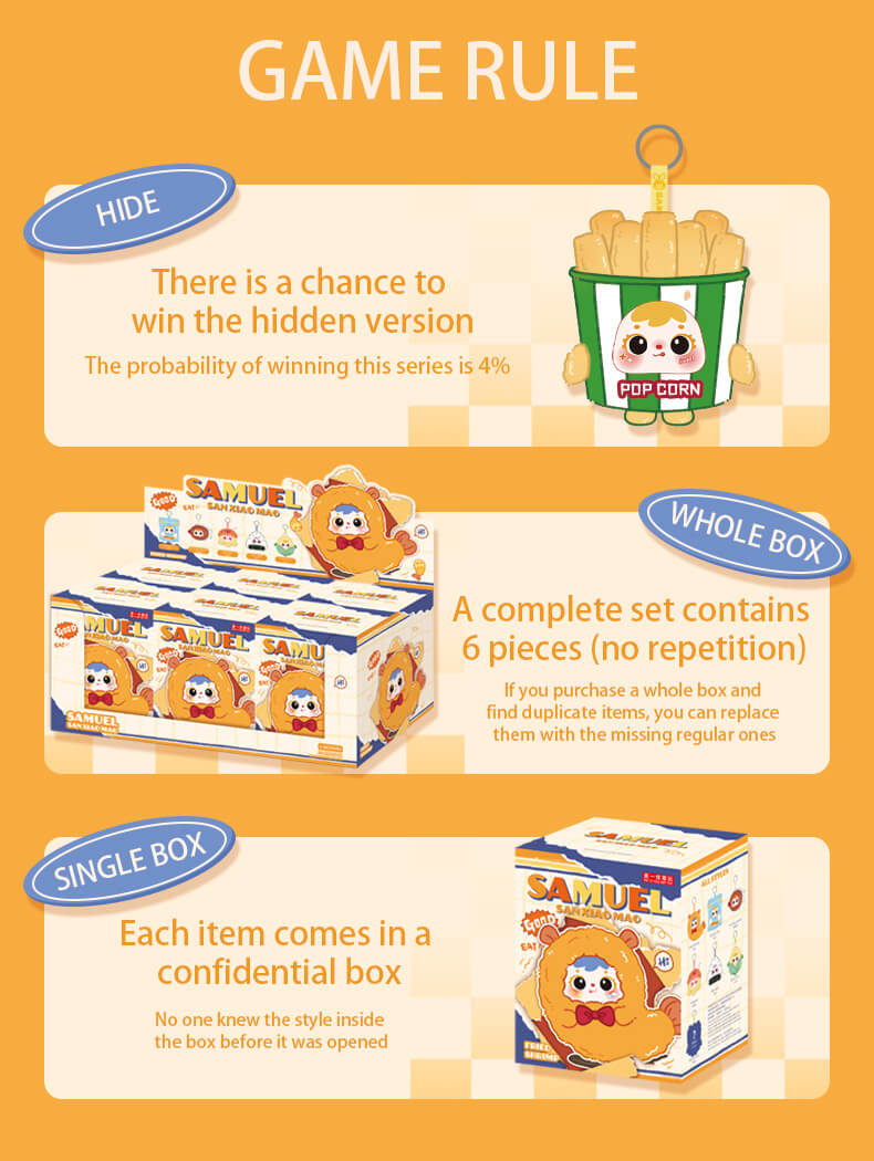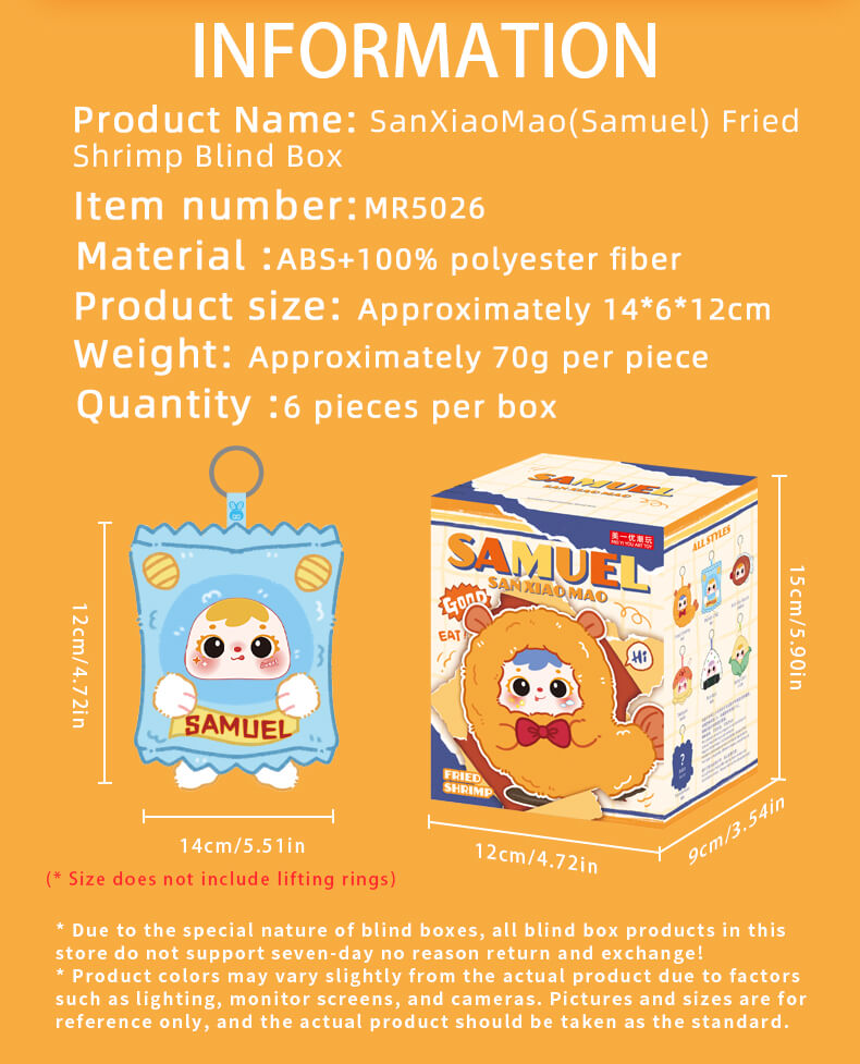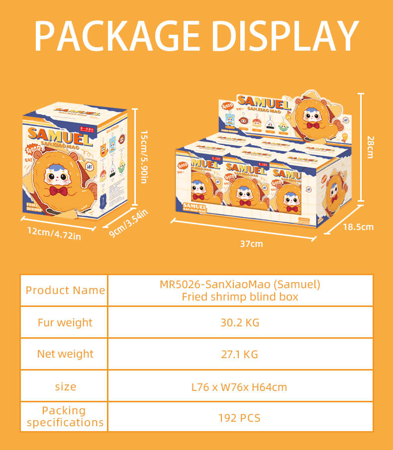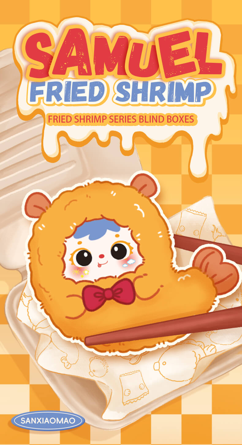 Golden yellow shrimp, as if just swam in a deep fryer Introducing the edition of the Samuel Blind Box Family Series—Fried Shrimp! This collection combines mouthwatering flavor with creativity. Every "Fried Shrimp" gleams with a golden shade as though it has freshly "dove”, through a crunchy fryer emitting an alluring playful sparkle.