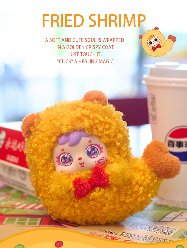 Open the “Fried Shrimp” blind box and bring home this golden, crispy, and fluffy fun and comforting treat, brightening up your collection cabinet!