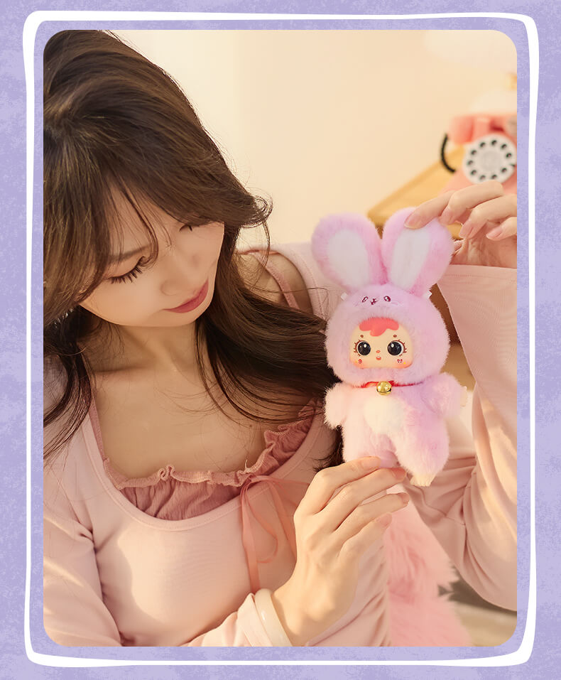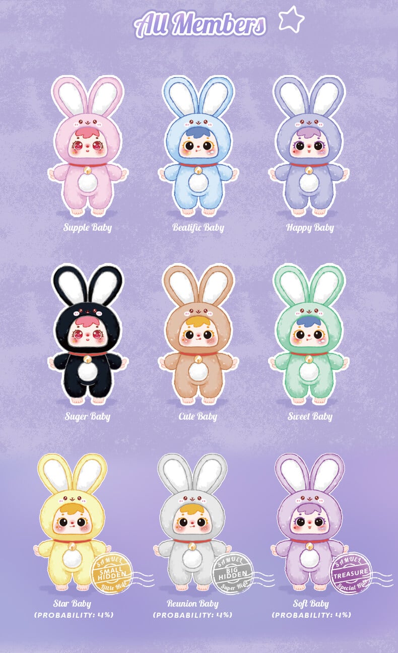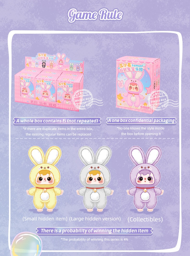The Samuel Blind Box Family Series: Lucky Rabbit Paradise showcases a collection of lucky messengers that embody beautiful symbolism. The main idea behind this series is **”Sharing fortune and illuminating your everyday life”** skillfully combining a plush rabbit motif with symbols of various auspicious blessings (, like four-leaf clovers, gold coins, rainbows and charms). These are not charming collectibles but also unique protectors that offer you positive vibes and a touch of luck.
